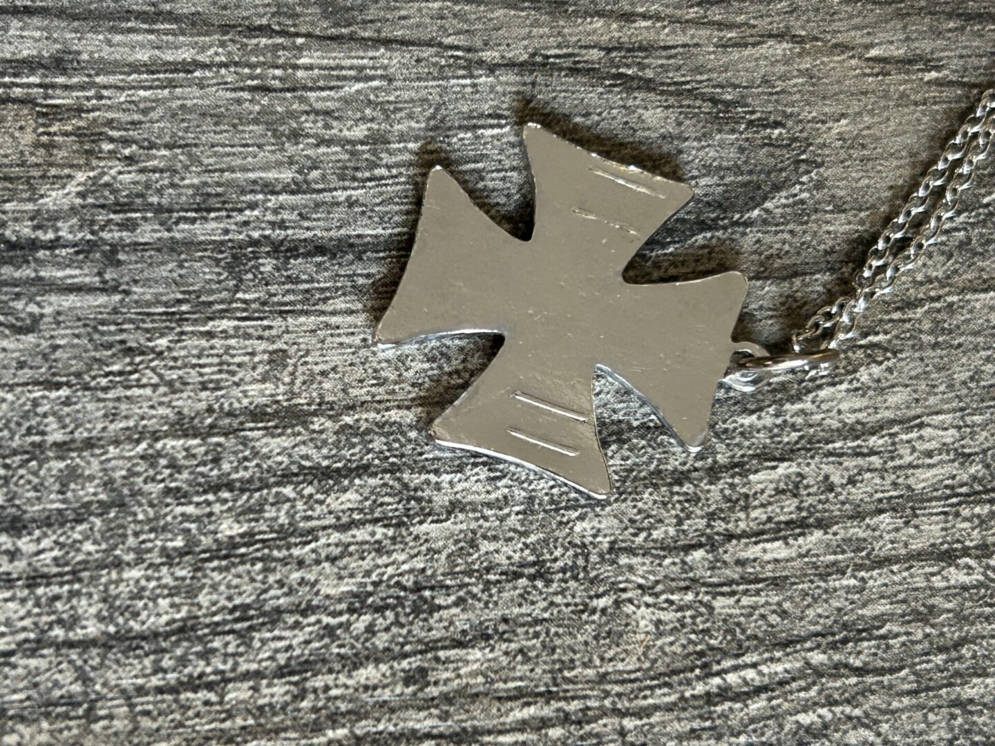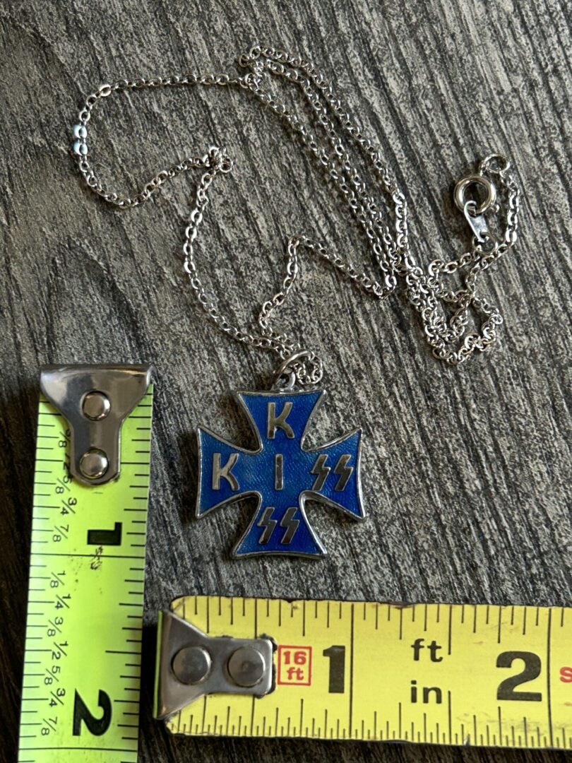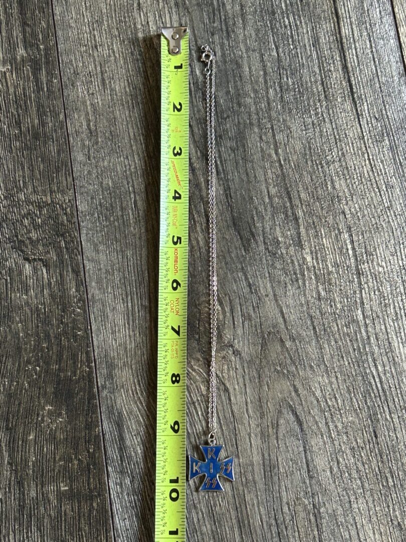 KISS Necklace Iron Cross Logo Silver Blue 1″ Vintage Kiss Memorabilia Aucoin
