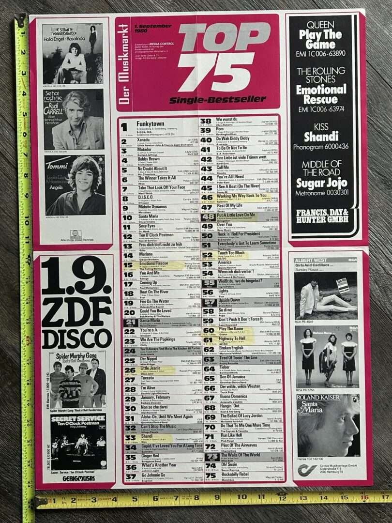 KISS Poster Germany Top 75 Singles Chart 1980 Shandi #33 Vintage Kiss Aucoin Era 16.5×23 — issued folded — the highlighted areas were done by the record sales rep — in Excellent condition from smoke free pet free home