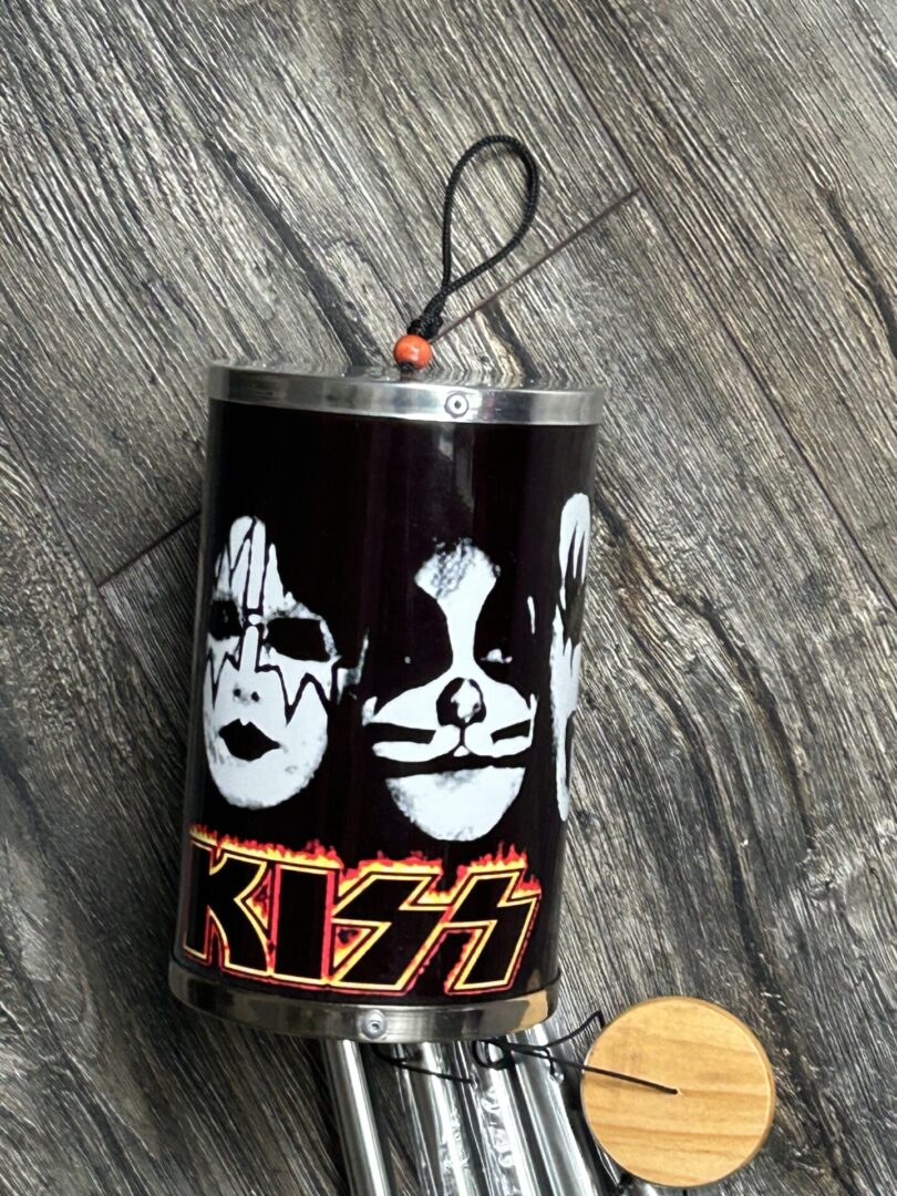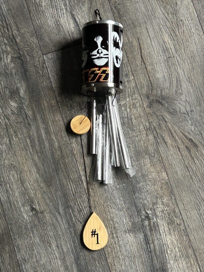 KISS Windchimes Fan Made 22″ Vintage Kiss Memorabilia has 1 broken thread but can be fixed if you are good at fixing things plus missing one of the chimes as well – If you are not good at fixing things just remove the chime with the broken thread and be done with it — otherwise in excellent condition from smoke free pet free home